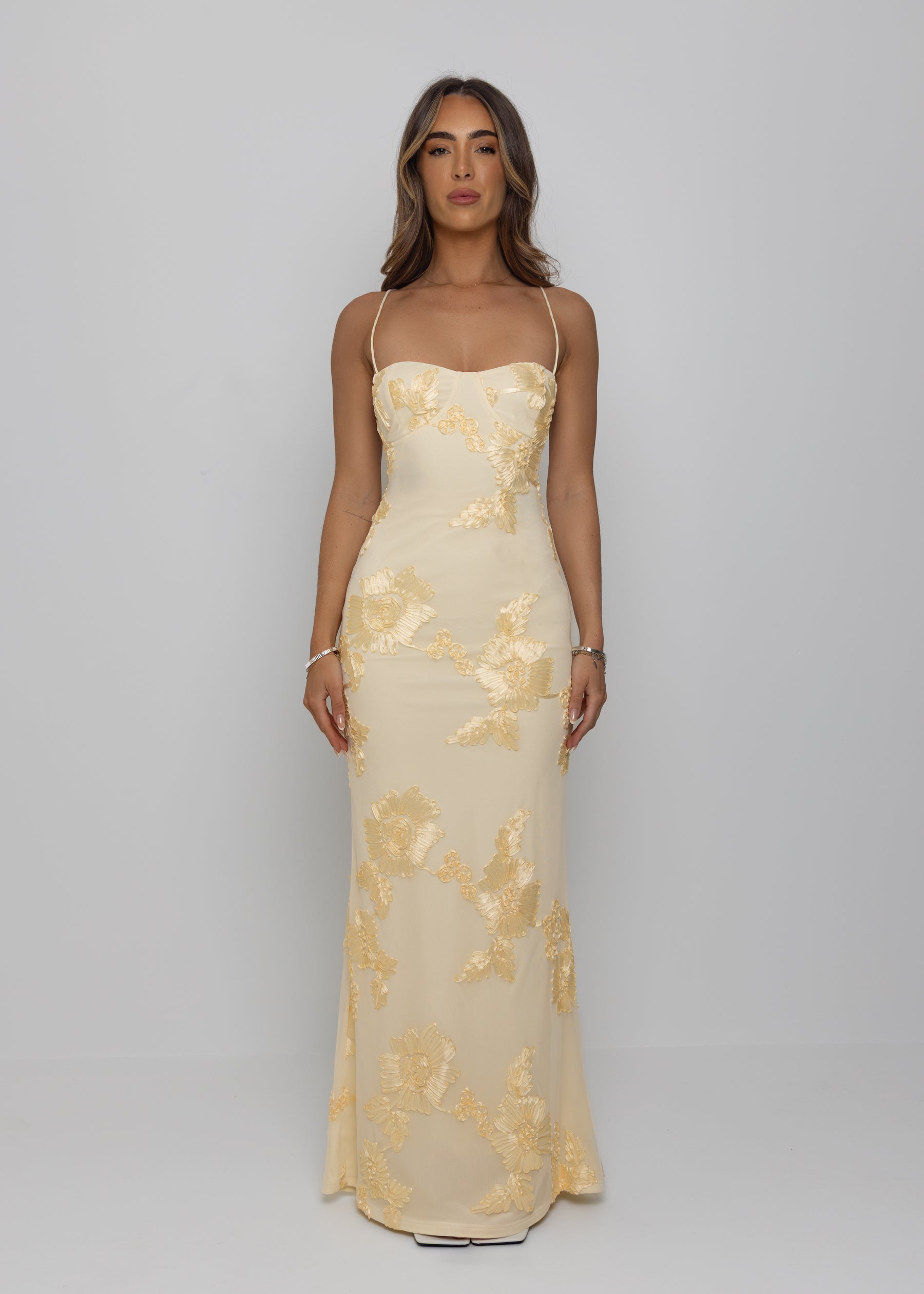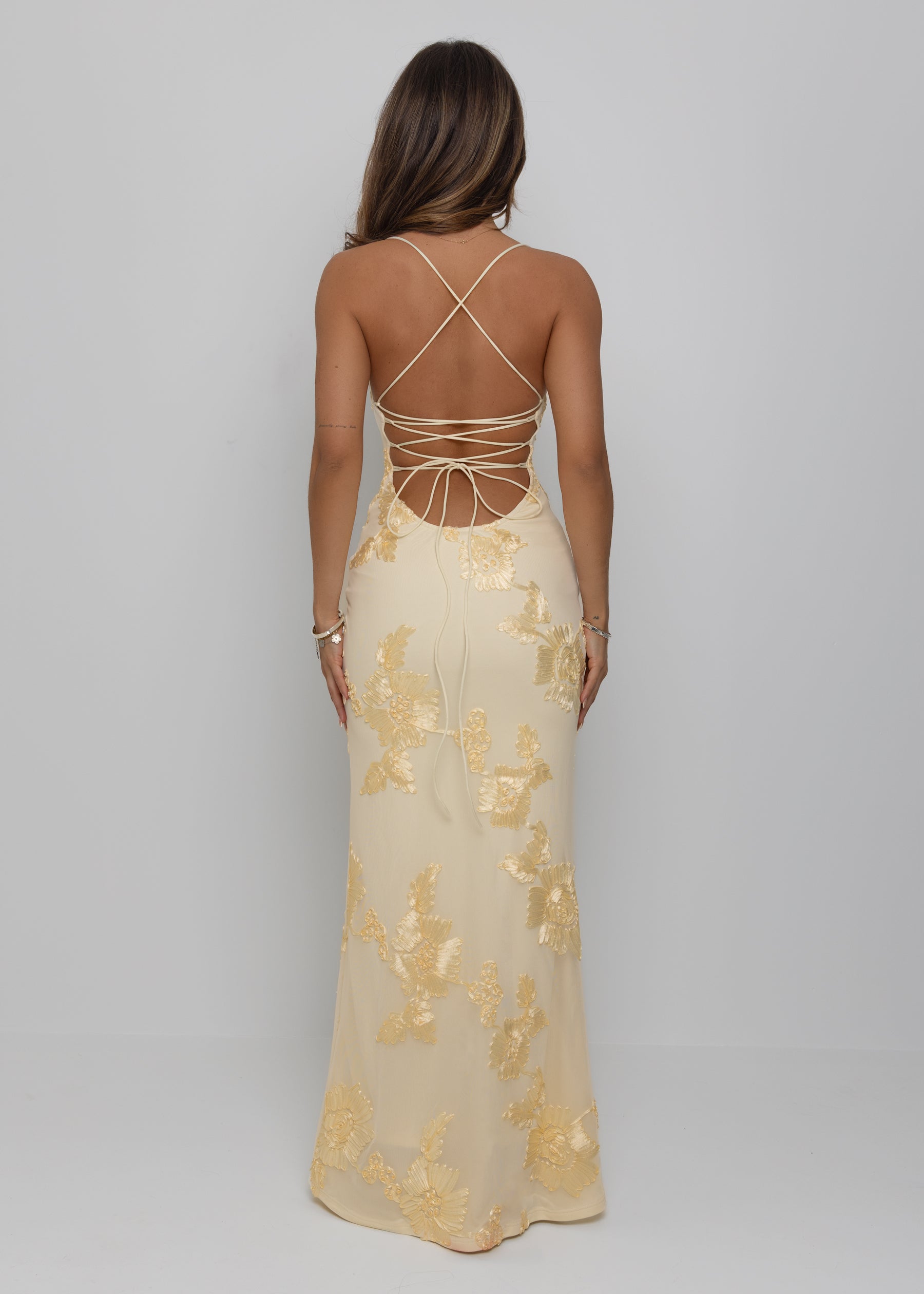 Soft, radiant, and effortlessly elegant, the Blissful Moments gown is made for unforgettable occasions. Designed in a delicate yellow tone, this figure-skimming silhouette drapes beautifully over the body. The bodice features delicate straps that frame the shoulders, while the lace-up back detailing creates a romantic, adjustable fit. Flowing into a graceful full-length hem, Blissful Moments captures the essence of sunshine, celebration, and timeless femininity. Perfect for formal events, summer soirées, and golden-hour moments.