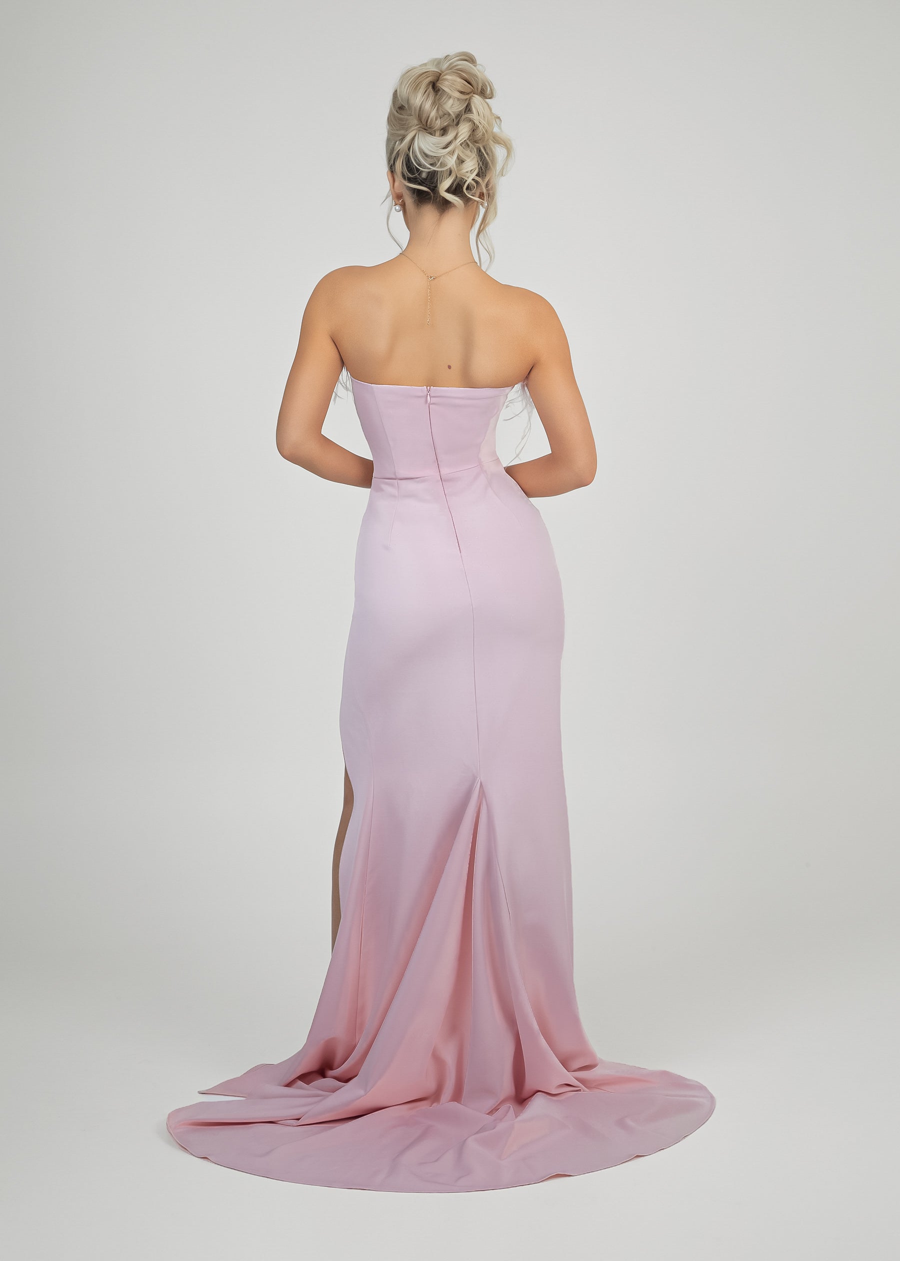 Soft, romantic, and undeniably striking, the Forever Yours gown is made to captivate. Rendered in a delicate blush pink, this strapless bodycon design hugs the figure in all the right places, creating a sleek and flattering silhouette. A plush feather trim adorns the bust, adding an elevated touch of glamour and texture. Finished with a bold thigh-high split for added allure and movement, Forever Yours is the perfect choice for elegant evenings, formal occasions, and moments that deserve to be remembered.