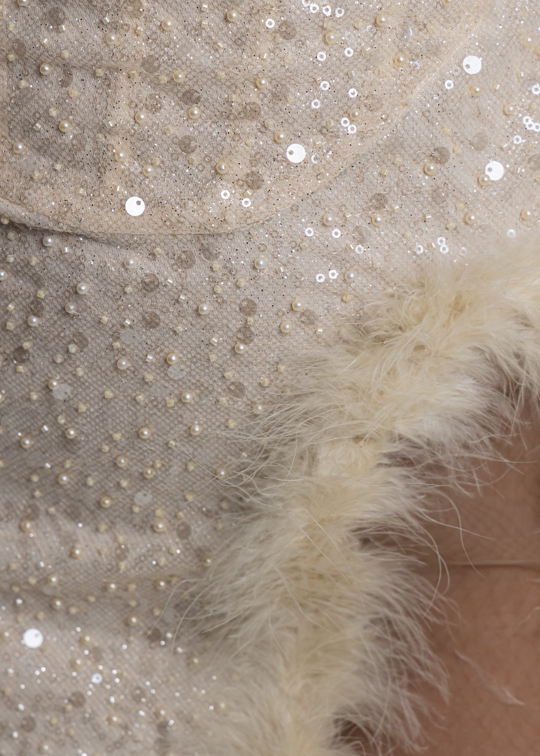 Im „Under the Spotlight“-Minikleid ziehen Sie die Blicke auf sich! Dieses trägerlose Kleid ist aus hochwertigem Stoff gefertigt und mit atemberaubenden Pailletten und Perlen verziert, die bei jeder Bewegung schimmern und das Licht einfangen. Das Kleid besticht durch sein stilvolles Korsett-Design, das Ihre Kurven betont, während der transparente Netzeinsatz mit passenden hochwertigen Federn jedem Look einen Hauch von Glamour verleiht. Treten Sie ins Rampenlicht und setzen Sie bei jedem Event ein Statement. Fühlen Sie sich selbstbewusst und schön in diesem Must-have-Kleid!