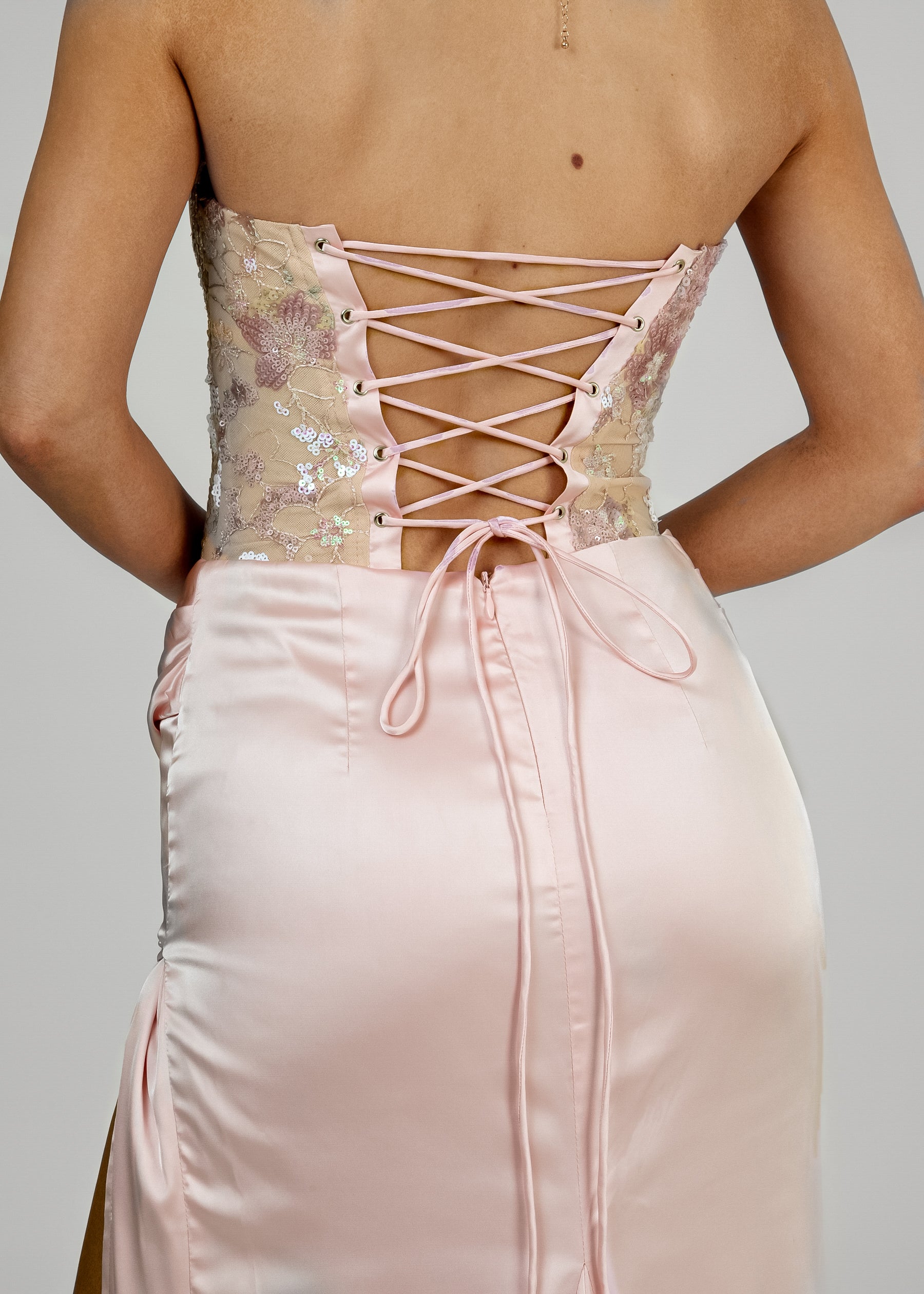 Soft, romantic, and effortlessly elegant, Love Blossoms features a strapless floral-embroidered corset bodice with a lace-up back for a beautifully sculpted fit. The silky satin skirt flows gracefully with a subtle thigh-high slit and delicate train, adding movement and allure. Perfect for formal evenings and romantic occasions, this gown is designed to bloom with every step.