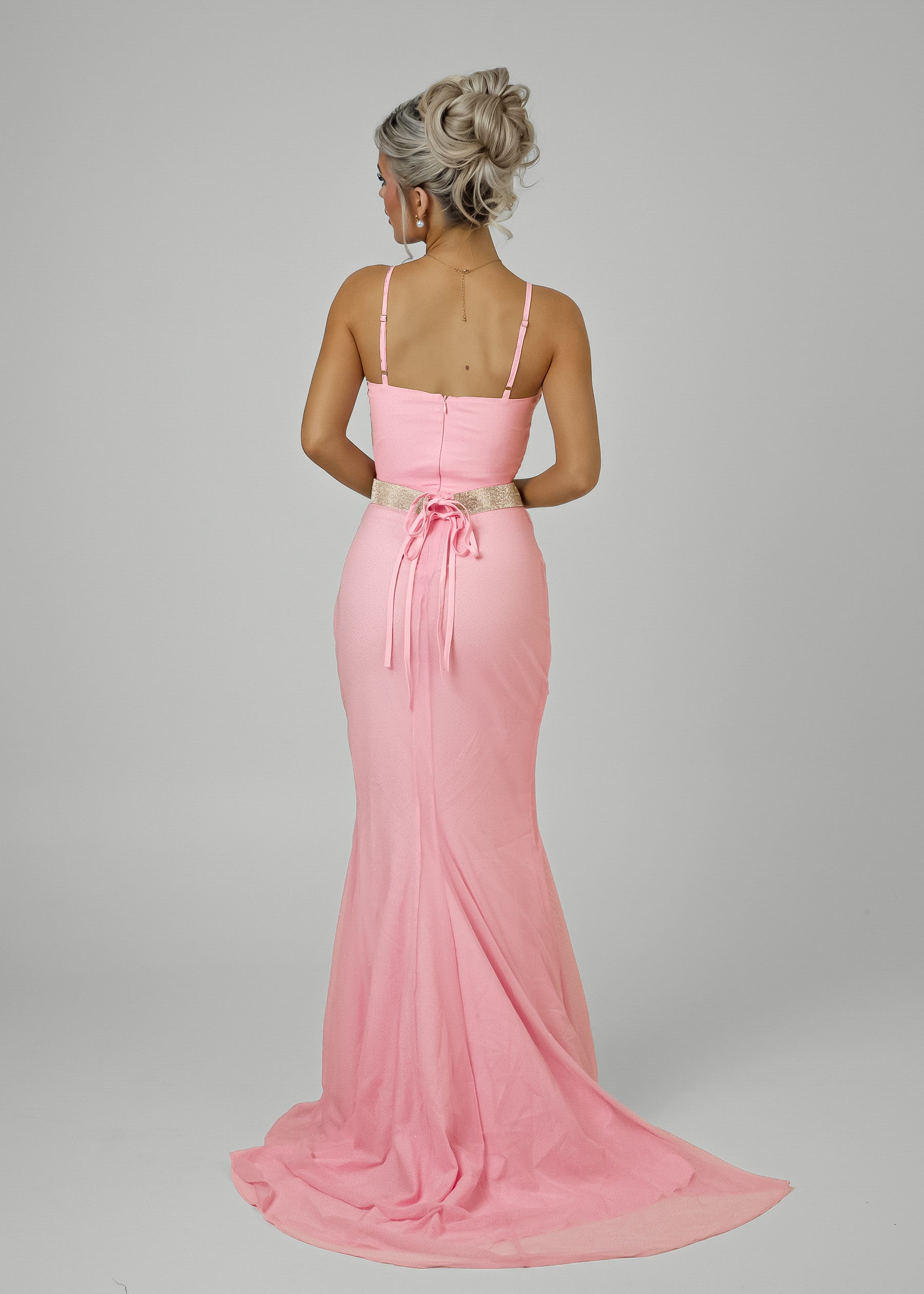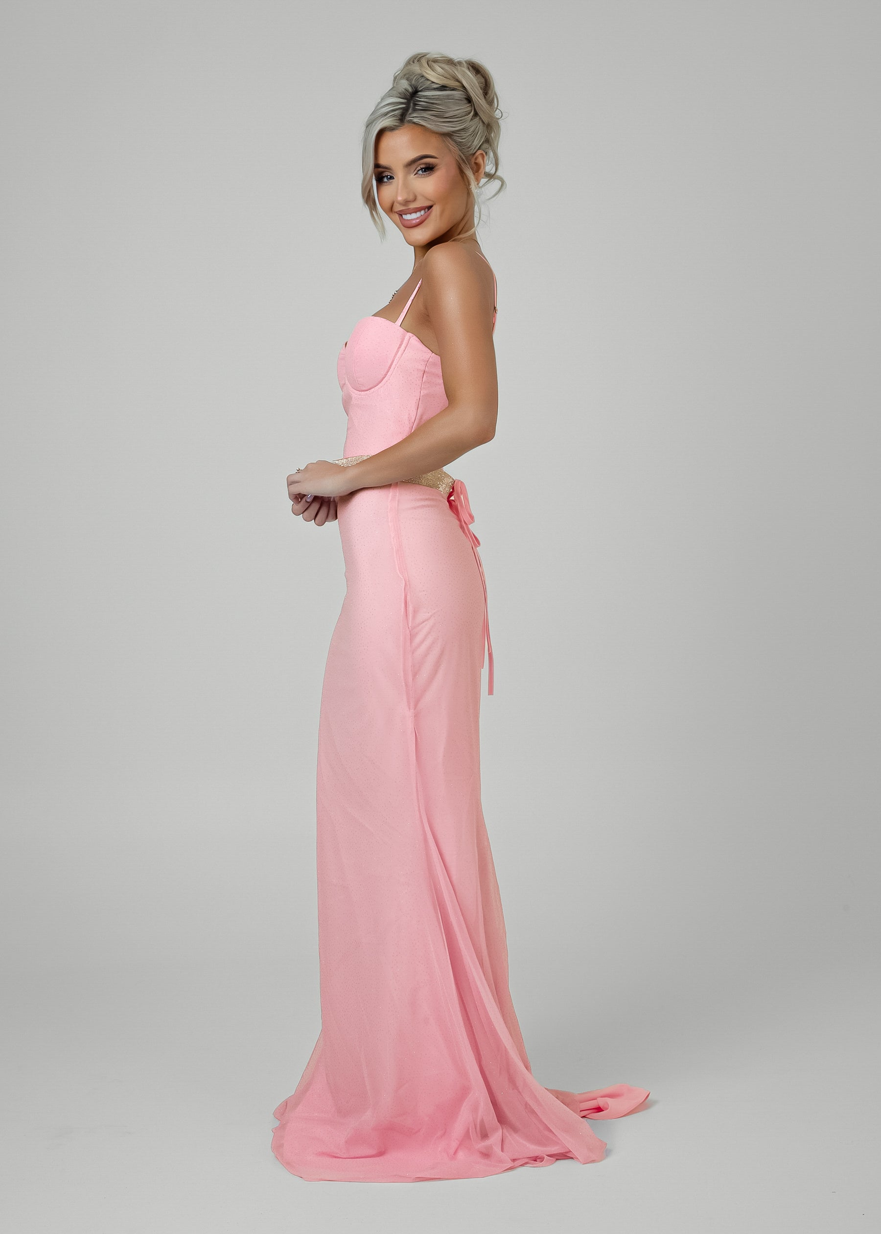 Schimmern und glänzen Sie in unserem Secret Love Pink Glitter Mesh Gown. Das figurbetonte Kleid ist mit glitzerndem Glitzernetzstoff und einem abnehmbaren Strassgürtel für einen Hauch von Glamour verziert. Perfekt für einen besonderen Abend – dieses Kleid wird garantiert alle Blicke auf sich ziehen und Ihnen das Gefühl geben, eine wahre Königin zu sein!
