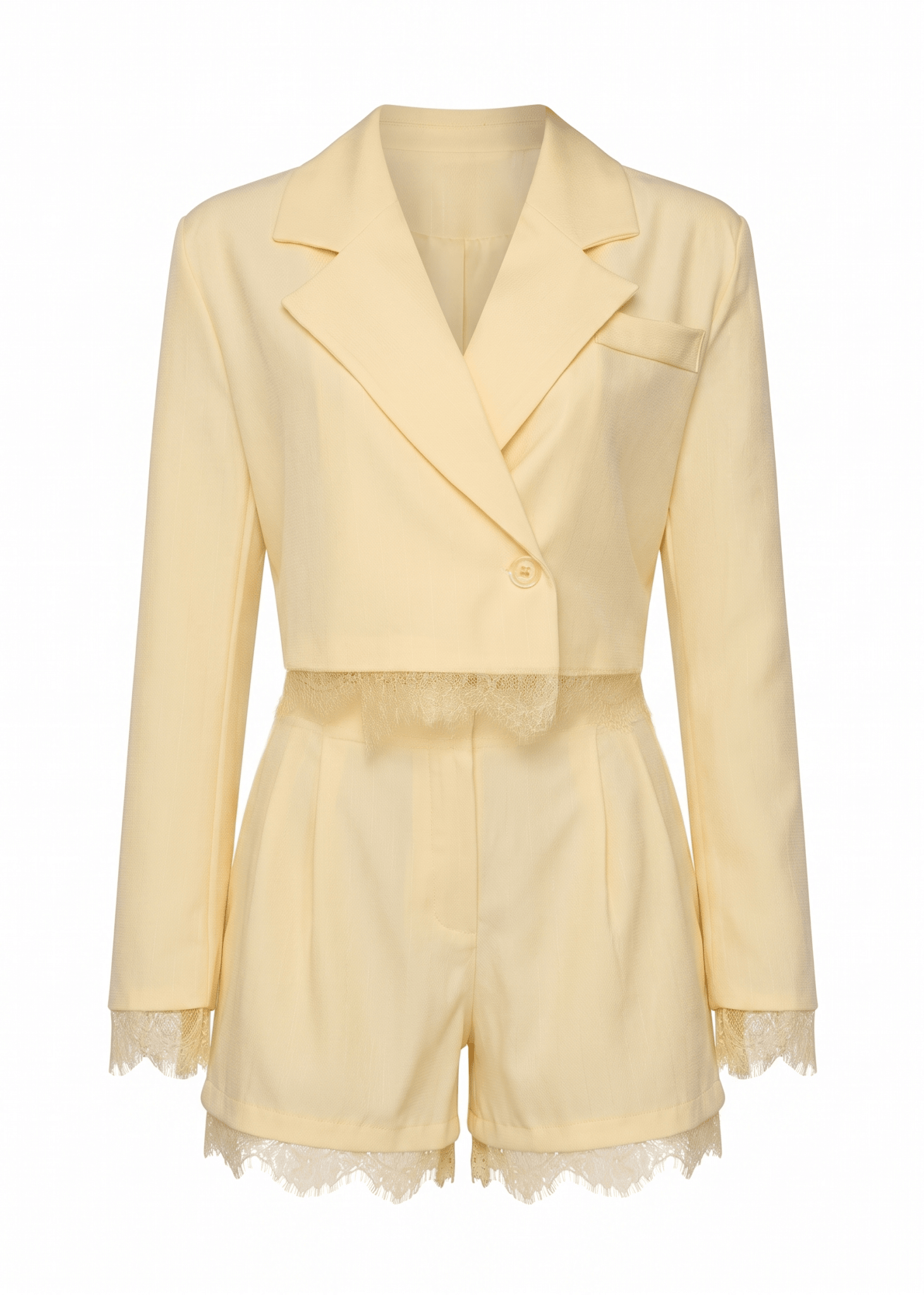 Fresh and playful, the Lemonade Two-Piece Set is made for sunny days and standout moments. Featuring an oversized cropped blazer-style top with a relaxed fit, it blends tailored structure with an easy, laid-back feel. Paired with matching high-waisted shorts, this set offers a flattering silhouette with a comfortable, breezy finish. The shorts are designed with a soft, flowy shape that skims the body, creating a polished yet playful look. Crafted in a light, refreshing hue, this set is perfect for brunch dates, vacations, or warm-weather outings.