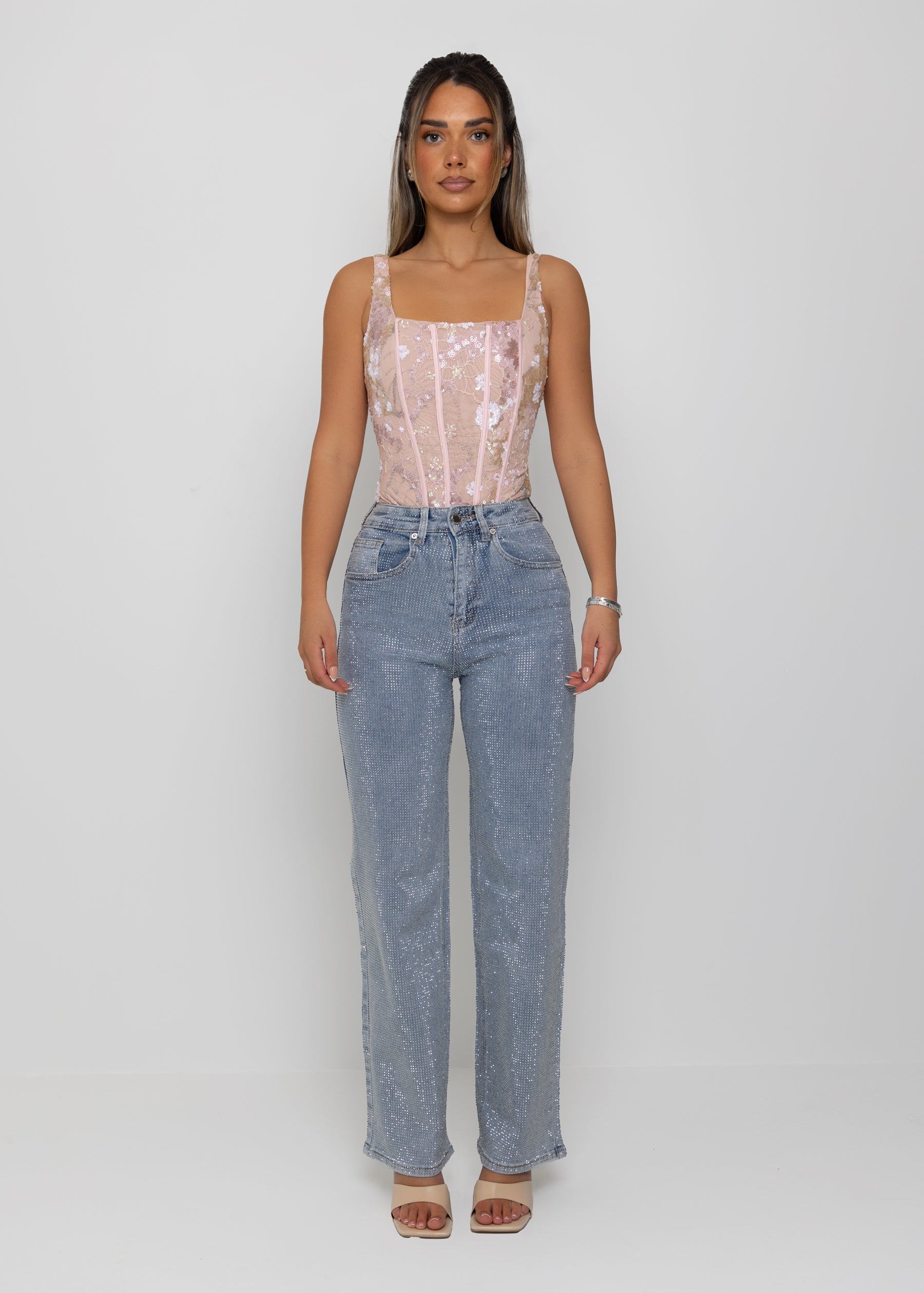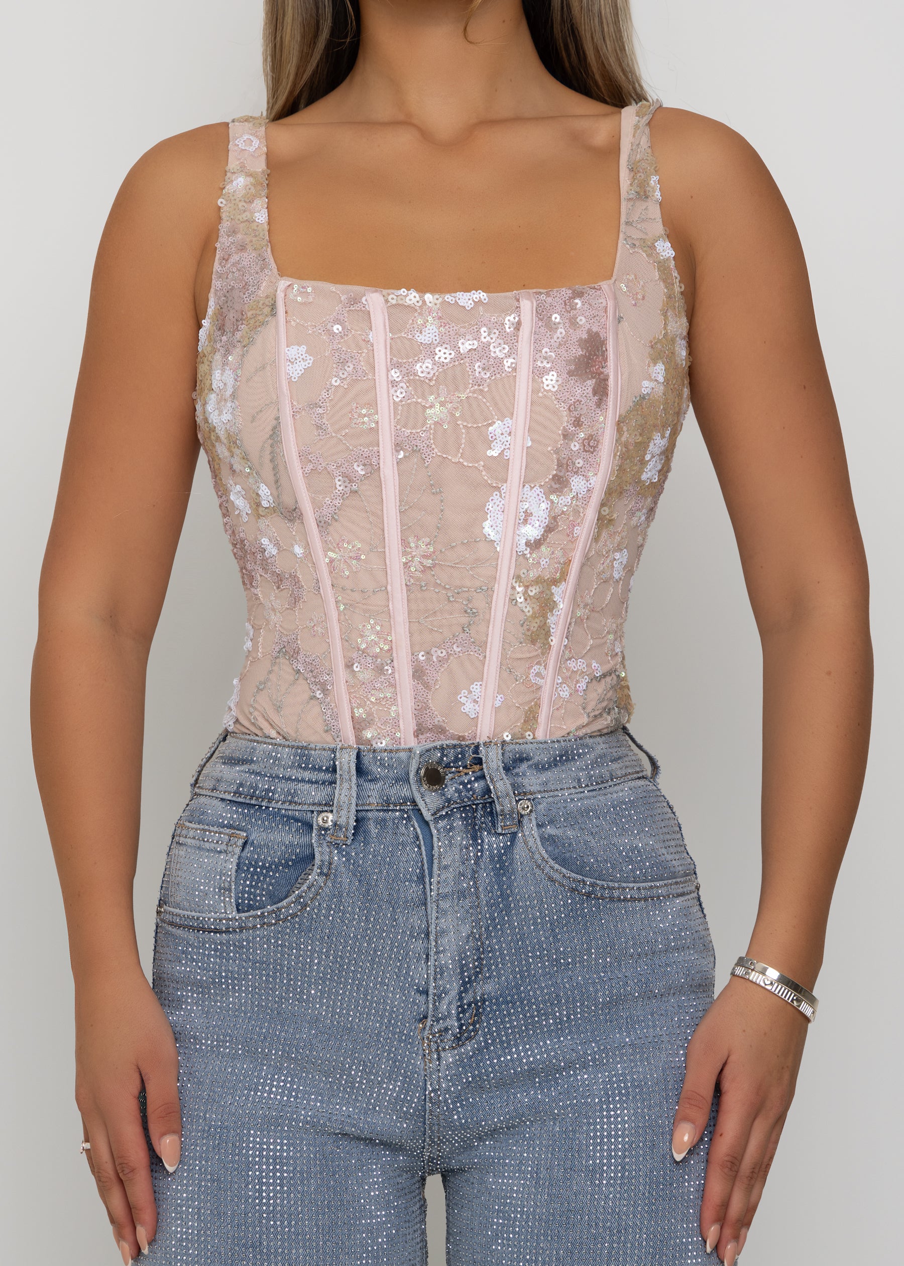 Romantic and intricately detailed, the Enchanted Moments bodysuit is designed to captivate. Featuring a floral-embellished corset-style bodice, this statement piece sculpts and defines the waist while adding a touch of delicate texture. Functional corset ties enhance the silhouette and allow for an adjustable, cinched fit. Blending structure with elegance, Enchanted Moments pairs effortlessly with tailored trousers, skirts, or denim for a look that feels both elevated and unforgettable.